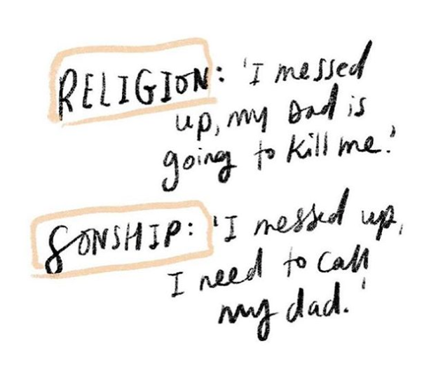 „Religion“ steht für ein Gottesbild, wo Gott als der strenge, strafende Vater dargestellt wird, der ständig über uns wacht und uns sofort eine auf die Finger gibt, wenn wir auch nur eine Kleinigkeit falsch machen.